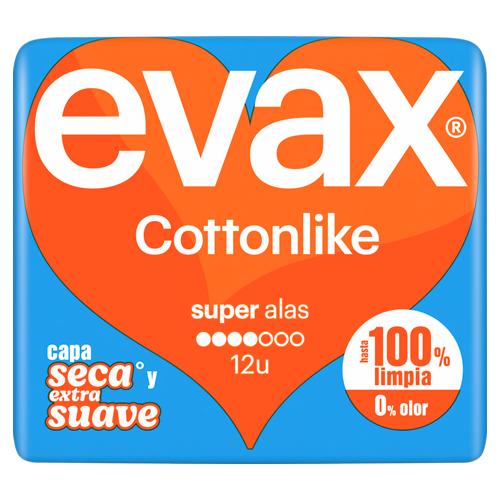 Compresas Evax Cottonlike Super, protección durante el día, X unidades. Absorben rápidamente, mientras que la capa superior extrasuave se mantiene seca. Cuentan con alas que se adaptan para un mejor ajuste. Sus perlas activas eliminan los olores. Hasta 100 % limpia y 0 % olor durante el periodo. Con Evax te sentirás limpia, te sentirás bien.